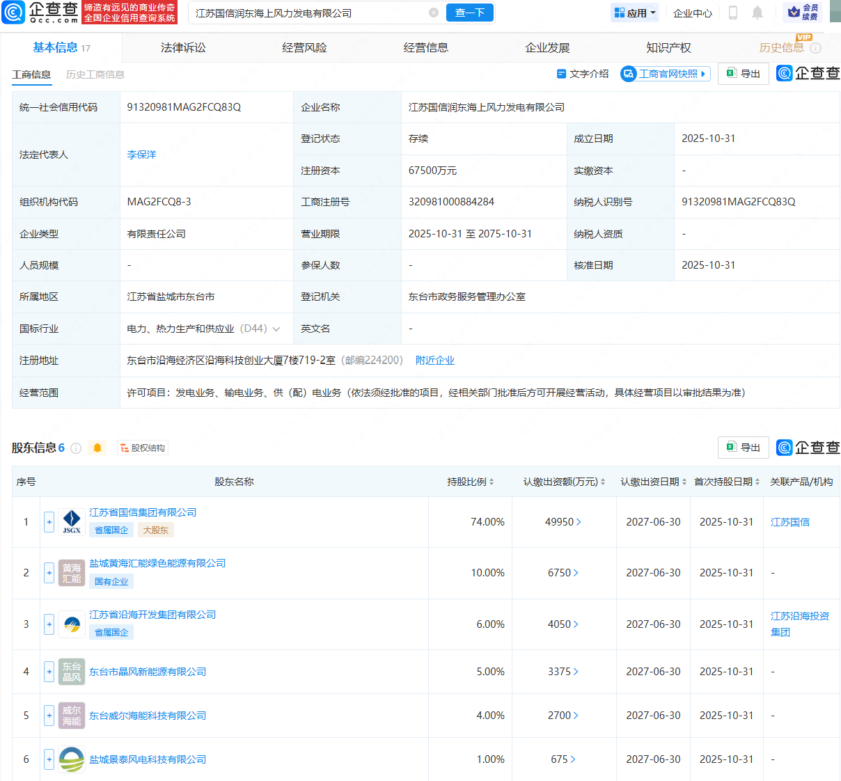近日,江苏国信润东海上风力发电有限公司成立,法定代表人为李保洋,注册资本为6.75亿元,经营范围包含:发电业务、输电业务、供(配)电业务。企查查股权穿透显示,该公司由江苏省国信集团有限公司、盐城黄海汇能绿色能源有限公司等共同持股。